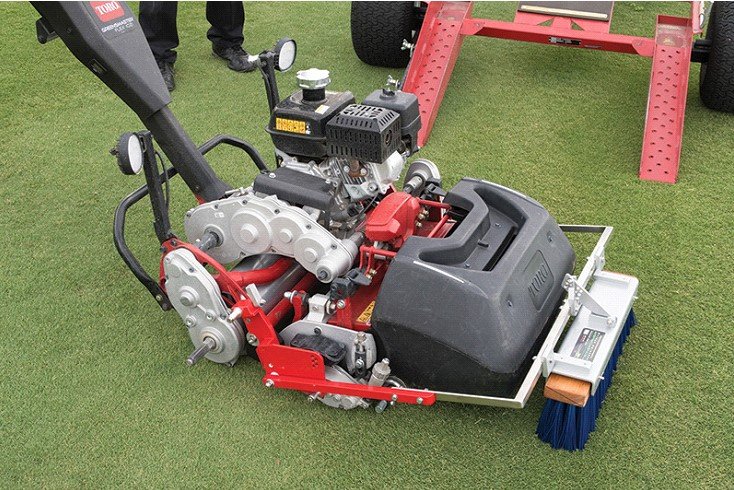 Una “greensmower” equipada con cepillo frontal, que levanta las hojas del césped, poco antes del corte.